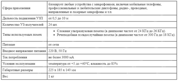 У прибора 24 излучателя ультразвука — такое количество излучателей создает очень мощную и эффективную помеху, действующую практически на любые микрофоны. В зоне действия прибора невозможно вести запись на смартфоны, диктофоны и другие гаджеты.
